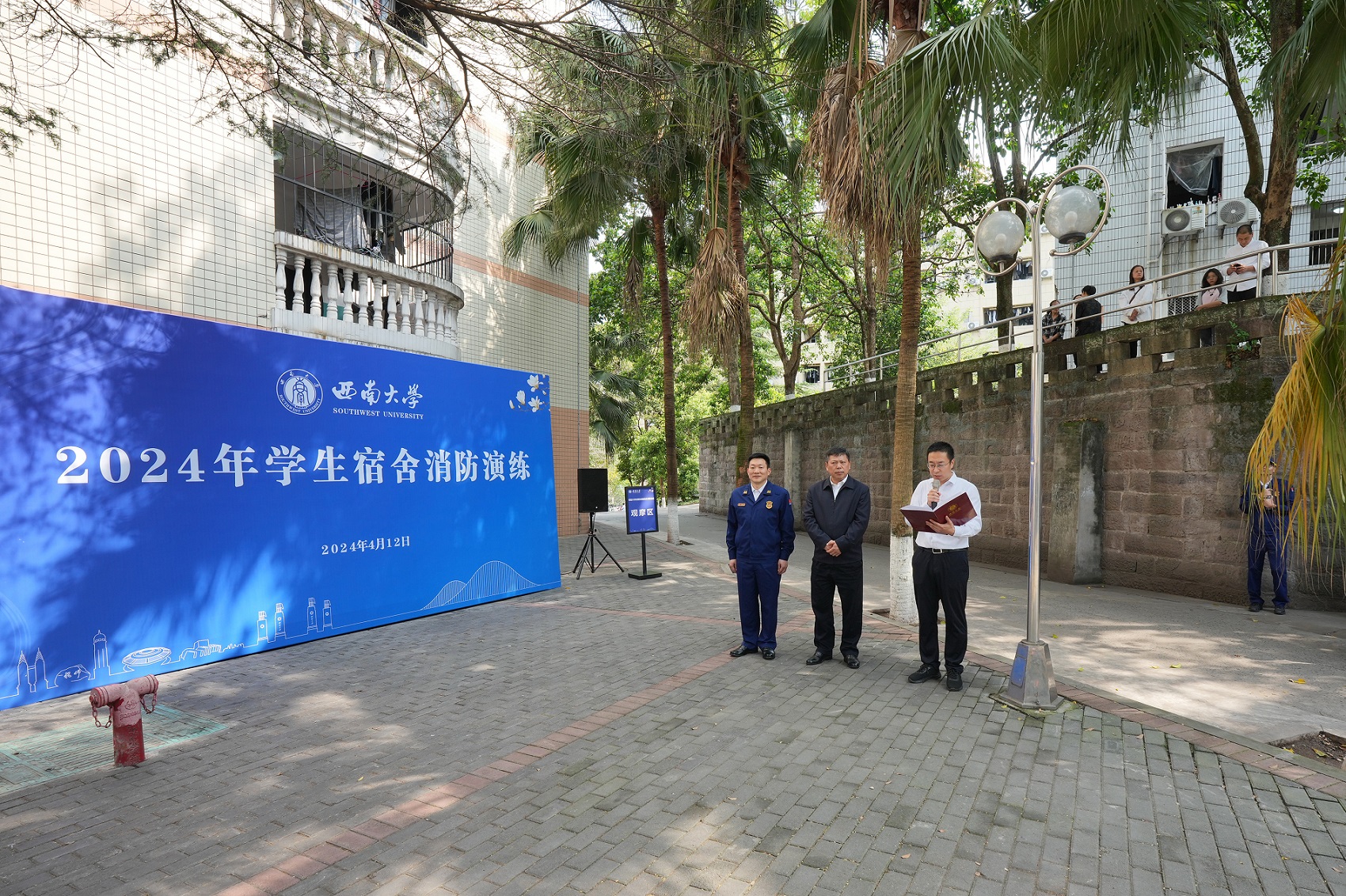 为进一步增强师生消防安全意识,提升应急灭火处置和疏散逃生能力,按照教育部有关工作要求,4月12日下午,学校在李园二舍开展学生宿舍消防演练,校长张卫国、副校长韩旭东,北碚区消防救援支队支队长刘亮森、副支队长刘锦强观摩演练。李园二舍楼栋志愿消防队及600余名学生、宿舍值班人员、保卫处应急处突队员、校医院医护人员以及北碚区消防救援支队城北消防救援站指战员参加演练。