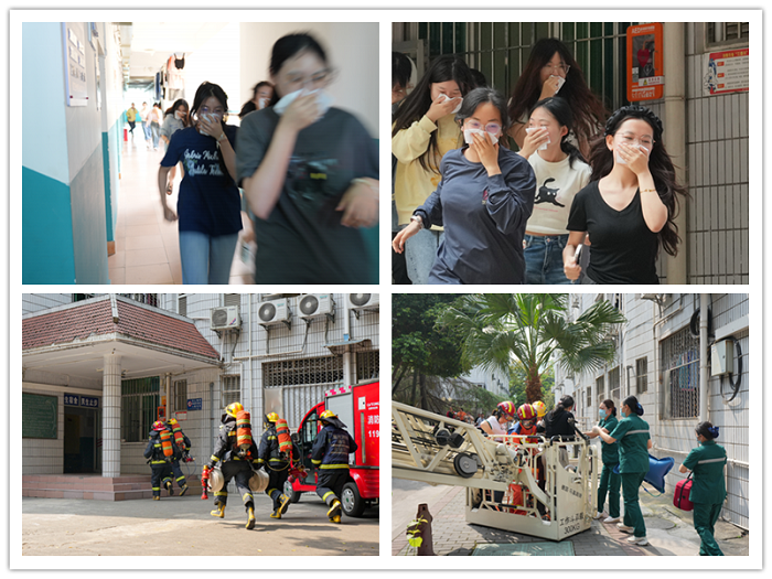 本次演练以李园二舍1寝室凌晨因电气线路故障引发火情为背景,分为火情报警、初期火情处置、疏散逃生、多力量应急救援等环节。张卫国宣布演练正式开始后,着火寝室学生立即展开初期火情自救;宿舍值班人员接到报告后立即通知楼层志消队员立即到达指定位置开展应急疏散,有序将人员疏散至安全区域;保卫处接警后,应急处突队员及安保人员迅速赶到现场,处置初期火情;随后,消防救援力量到达现场,开展灭火扑救,利用消防云梯车实施高空救援,成功营救被困人员;校内医疗救护力量到达现场,对受伤人员实施救治工作。至此,此次消防演练在各部门通力协作下,成功扑灭火情,3分钟时间内,600余名学生迅速、有序疏散至安全区域。