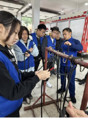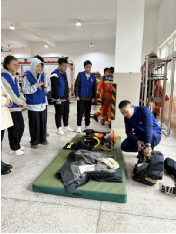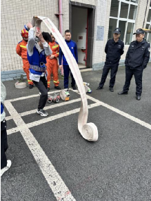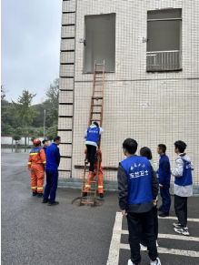 随后,大家观摩消防员救援爬梯和日常甩水带技巧。消防指战员与同学们开展了互动教学,在“蓝朋友”的保护下,大家体验了爬梯和甩水带,通过亲身体验,同学们更加深刻地体会到消防工作的艰辛,对应急管理工作产生敬意。